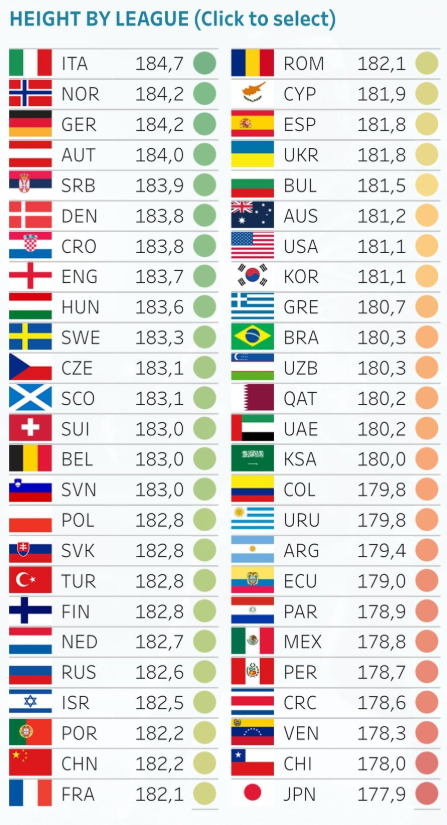 在联赛球员平均身高这一数据上,欧洲联赛尤其是北欧联赛在榜单上名列前茅。意甲以1.847米占据榜首,后面依次是挪超、德甲、奥超和塞尔维亚超级联赛。